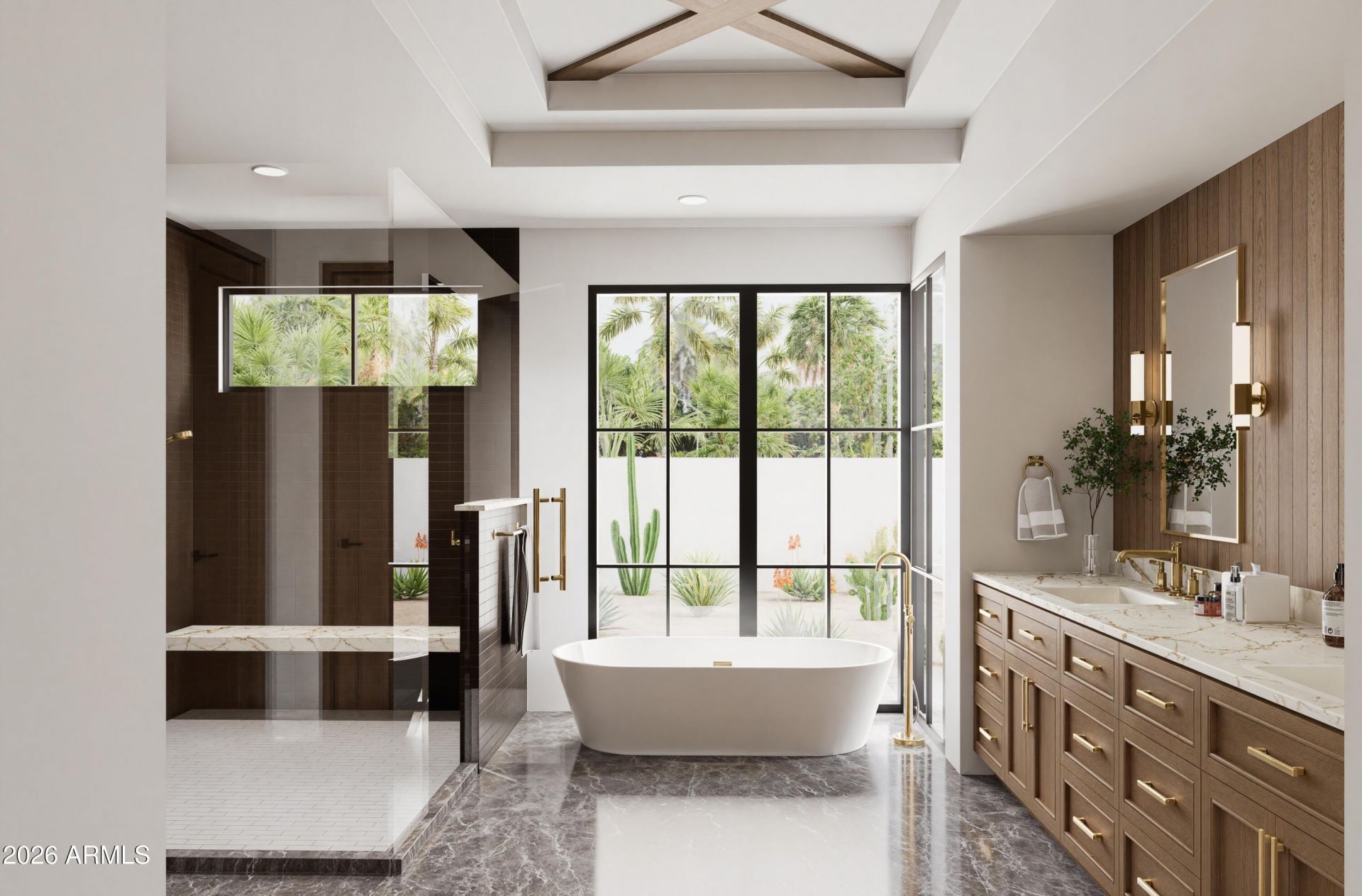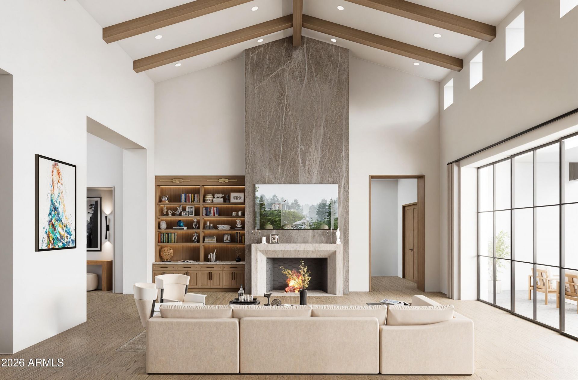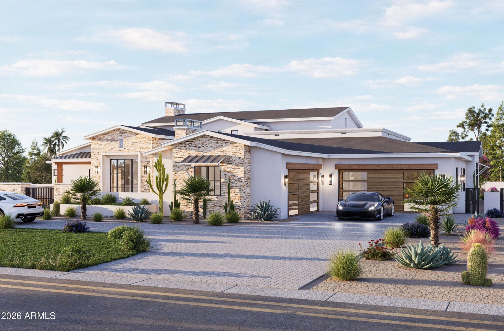 Planned completion Summer 2026.This custom residence, built by Armstrong Construction Group and designed by Tom Mooney Design, blends modern luxury with timeless architecture. The main home offers 6,294 SF with 4 beds, 5 baths, an office with separate entrance, and a kids flex room. All this is complemented by a 677 SF 1 bed/1 bath guest house, all set on just under an acre. Room to add pickleball court if desired.Interiors curated by Janet Brooks Design feature stunning charcoal and warm toned millwork along rich pecan-colored wood flooring. The open floor plan is filled with natural light and includes a chefs kitchen with a hidden back kitchen, a separate pantry, a secondary living wing, and an oversized laundry room with dual washers and dryers plus dog wash for Fido. The primary suite and office occupy a private wing, with the office offering its own entrance and patio. Outdoor living showcases an extended pool, ramada with fireplace, and generous entertaining areas designed for year round enjoyment.
