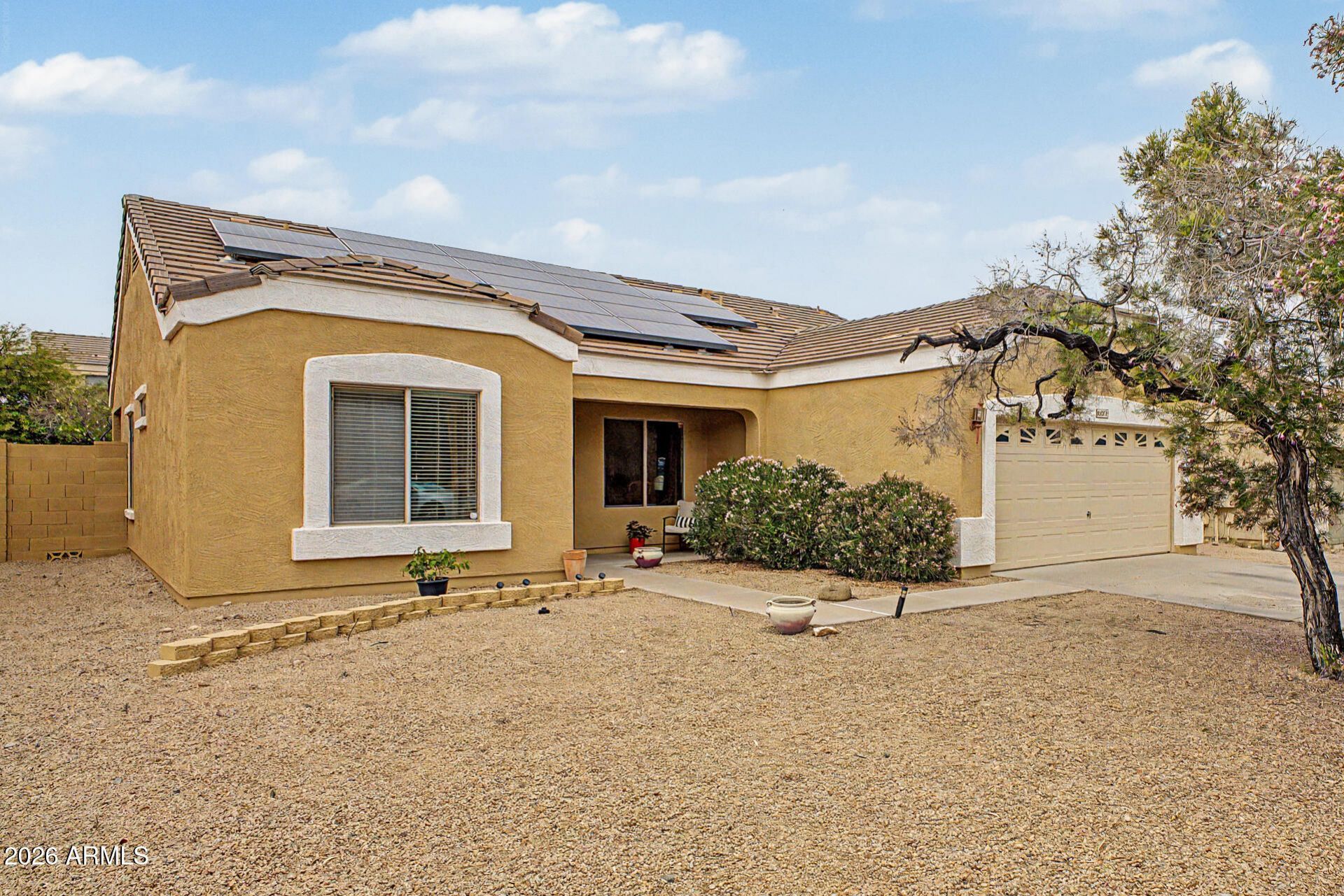 Come create your dream! Become the proud owner of this charming 3-bedroom home featuring energy-saving solar panels and a sparkling pool! Upon entering, you will immediately notice an inviting living room ideal for welcoming guests and everyday relaxation. Tile flooring, abundant natural light, ceiling fans, and custom palette are worth mentioning. The eat-in kitchen comes with track lighting, stainless steel appliances, ample cabinets, and a convenient pantry. Discover the perfectly sized primary bedroom, offering plush carpet, a private bathroom, and a walk-in closet. Spacious backyard is thoughtfully designed for year-round enjoyment, showcasing a covered patio, paver seating area, and a swimming pool. This rare gem has everything youre looking for!