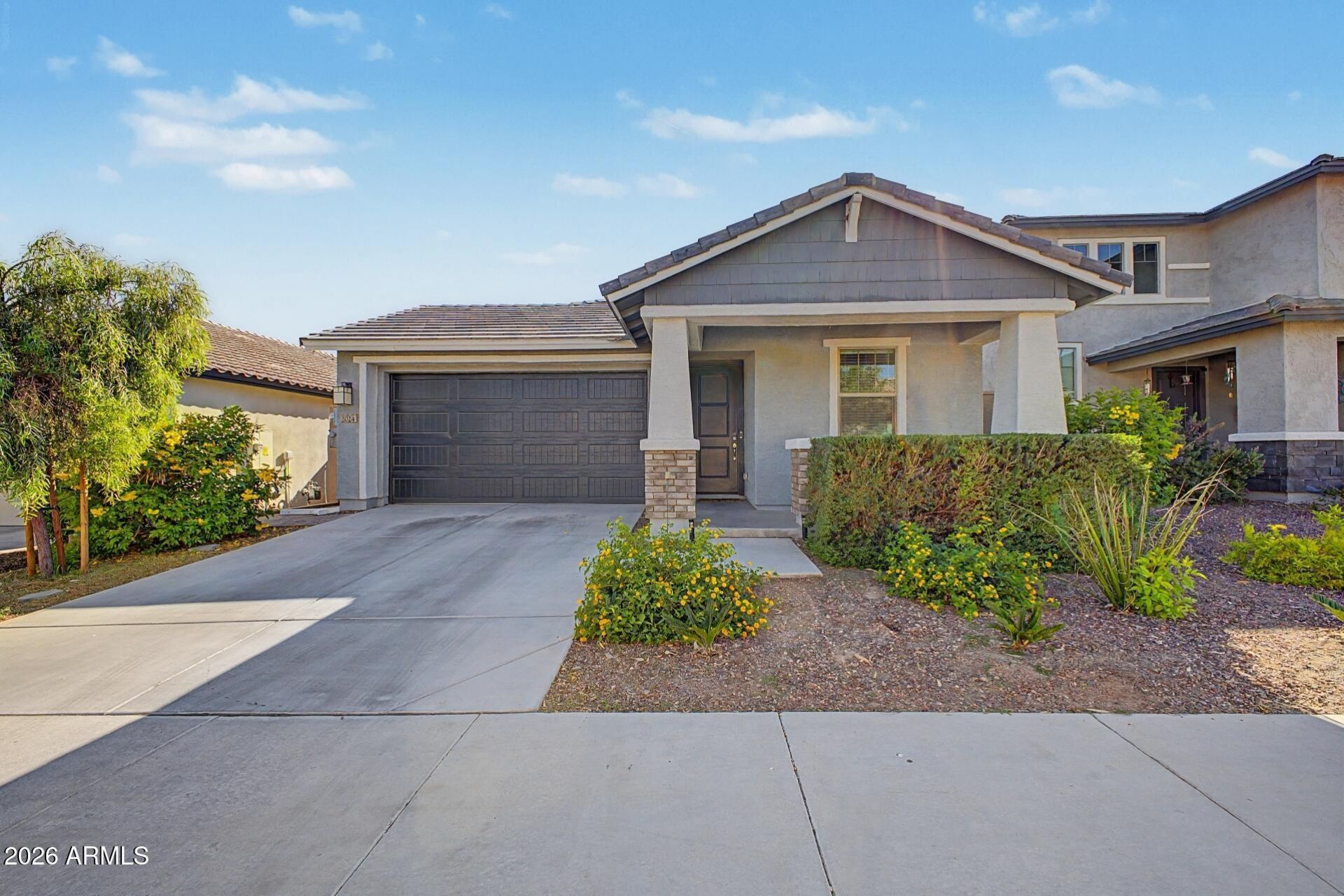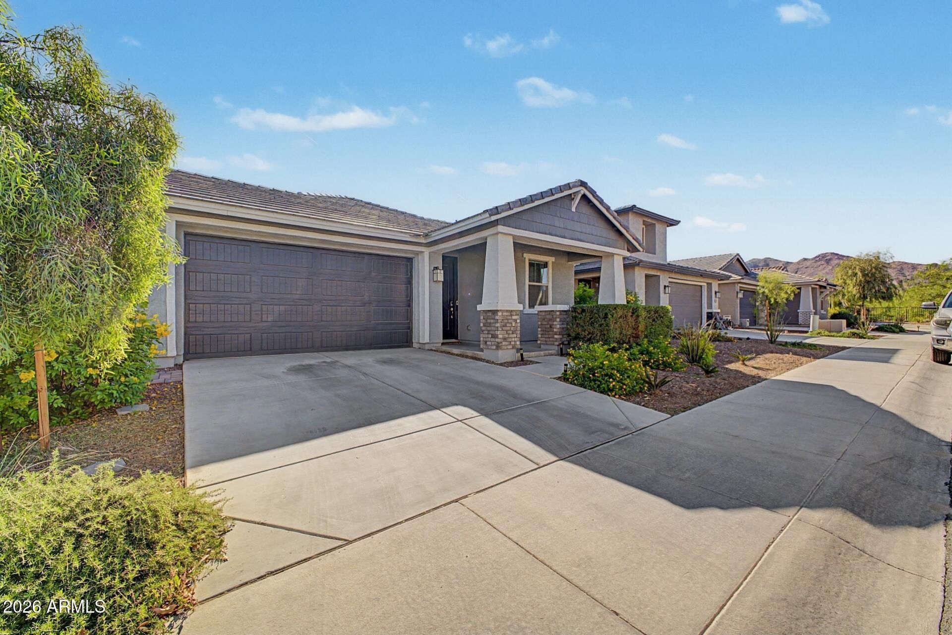 This beautifully crafted residence features 4 bedrooms and 3 full bathrooms, centered around an open concept great room thats perfect for both everyday living and entertaining. The chef-inspired kitchen showcases stunning granite countertops, elegant Chiffon cabinetry, a stylish tile backsplash, and GE stainless steel gas appliances, with additional gas connections at the dryer and patio ideal for outdoor BBQs. Wood-look luxury vinyl plank flooring flows throughout the main living areas, with plush carpeting in the secondary bedrooms for added comfort. Designer touches continue with classic pendant lighting over the kitchen island, 5 baseboards, and window treatments already in place. Enjoy enhanced living with 52 ceiling fans in all bedrooms and an impressive 72 fan in the great ro along with prewiring for 5.1 surround sound perfect for movie nights or game day. Additional features include a soft water loop pre-plumb, recessed lighting in the great room and owners suite, and quality finishes throughout. Located in the highly sought-after Verrado community, known for its charming small town feel, tree lined streets, golf, dining, and scenic trails this home truly offers the best of Arizona living.