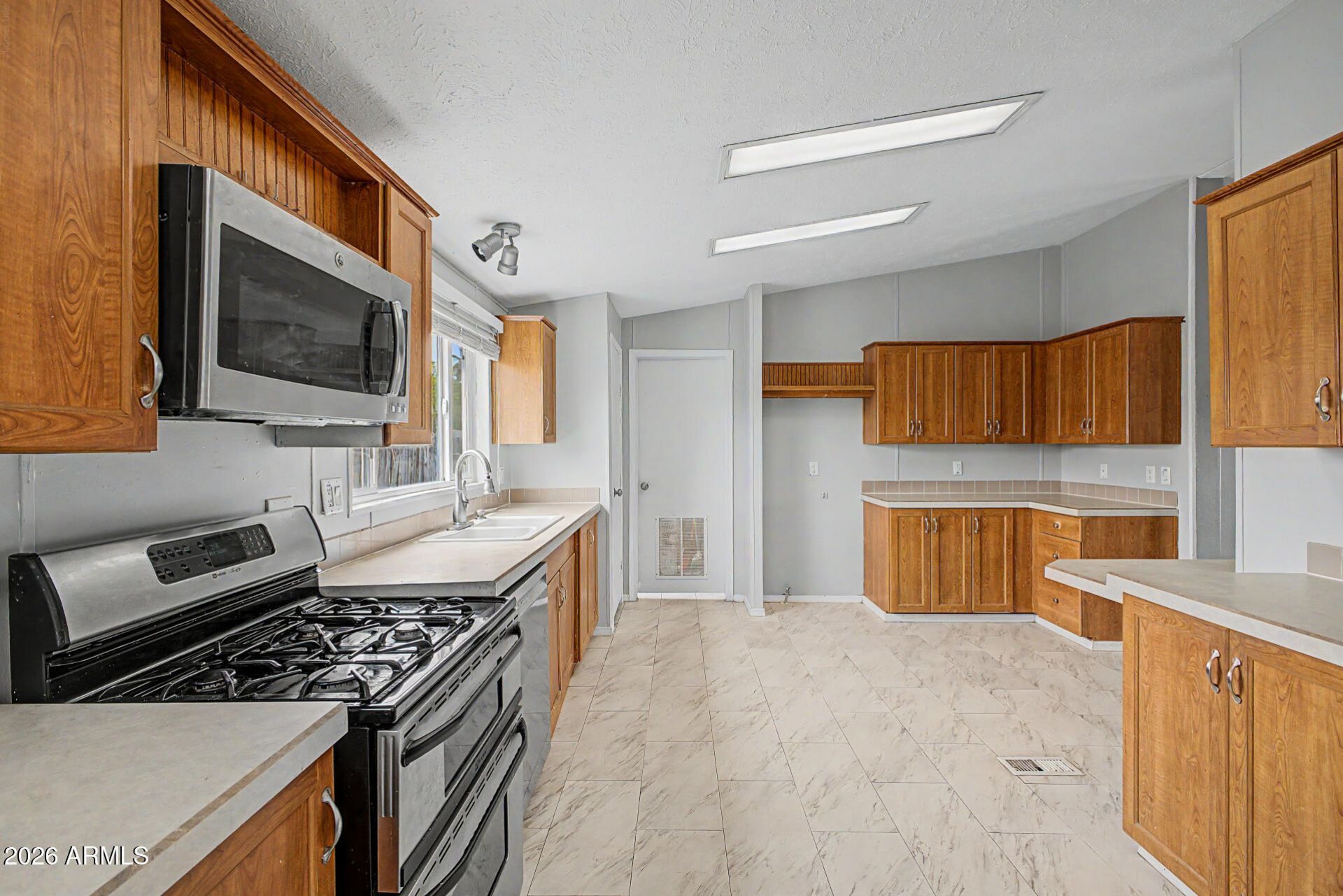 Fully fenced mobile home on a desirable corner lot! The expansive front yard is beautifully accented with charming pavers and provides plenty of room for customization. Discover gravel parking that ensures convenient space for multiple vehicles! Inside, youll find a delightful interior featuring vaulted ceilings, wood-style flooring, a cozy fireplace, and generous living areas. Large kitchen boasts ample counter space, stainless steel appliances, fluorescent lighting, a plethora of cabinetry, and a handy pantry. The main bedroom is a private sanctuary with a spa-inspired bathroom comprising a soaking tub, dual sink vanity, skylights, a step-in shower, and a walk-in closet. The blank canvas backyard invites your imagination! Move-in now!