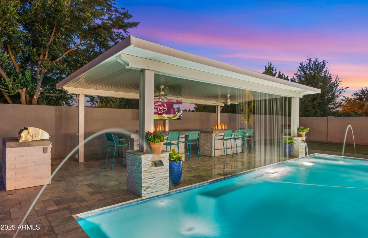PRICE IMPROVEMENT!! GORGEOUS luxury estate in the highly sought after community of Hastings Farm, walking distance to thousands of sf of new retail, restaurants and entertainment! Available fully furnished, this single-level residence offers 3,626 sq ft of thoughtfully designed, open-concept interior living on a spacious 14,352 sq ft lot. Step outside to your brand new $300,000 backyard escape with a stunning new resort-style pool, multiple water features, an enormous poolside outdoor living room with BBQ, TV, and 2 enormous fire tables. An oversized covered patio space with dining, multiple TVs and extended roofline reaching the sparkling blue pool waters. This backyard belongs on the cover of a luxury magazine! Inside, youll find a bright, modern layout featuring newly installed, modern flooring, granite countertops, a chefs kitchen with oversized island, walk-in pantry, built-in sports bar, and premium stainless-steel appliances perfect for hosting or enjoying everyday comforts. With 4 large bedrooms + a versatile flex room, 3 full bathrooms, and a 3-car garage, this home has room to live, work, and entertain in style. Tucked away in a quiet cul-de-sac with breathtaking mountain views, a fully fenced yard, and just minutes from top-rated schools, brand-new shopping, dining, and entertainment. Offered fully furnished, this turn-key home blends high-end finishes, recent interior and exterior upgrades, and unbeatable value. All thats missing is YOU!