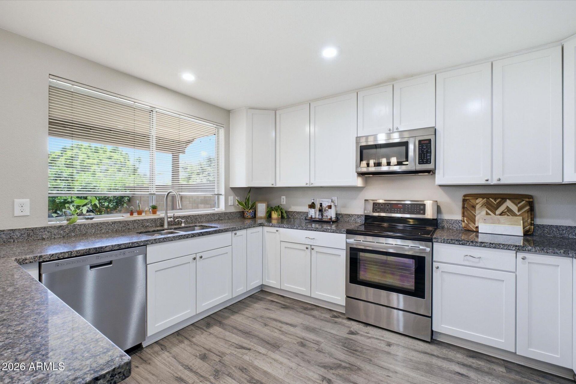 2865 E Hermosa Vista Drive Mesa, AZ, 85213.-Single-level home on a large lot, thoughtfully updated and move-in ready. This spacious 3-bedroom home includes a den and an additional bonus room, offering flexible living spaces to fit your needs. Luxury vinyl plank flooring runs throughout the home, creating a modern and cohesive feel. The kitchen features granite countertops, stainless steel appliances, a breakfast bar, and a cozy breakfast nook. Enjoy a generously sized family room. The bonus room is perfect as a game room, secondary living area, or media room. The large primary suite includes a well-appointed bathroom with dual vanity, a separate tub and shower, walk-in closet, and private water closet. One of the secondary bedrooms features elegant double-door entry & wall of closet space. Additional highlights include a spacious laundry room with built-in cabinetry and extra storage space. Garage cabinets, electric vehicle charging station. Step outside to an extended covered patio overlooking a large grassy backyard--ideal for outdoor living. The yard also includes a wood storage shed tucked neatly in the corner.Near Hermosa Vista Park, freeway access to the 202, shopping and dining. Fabulous location!